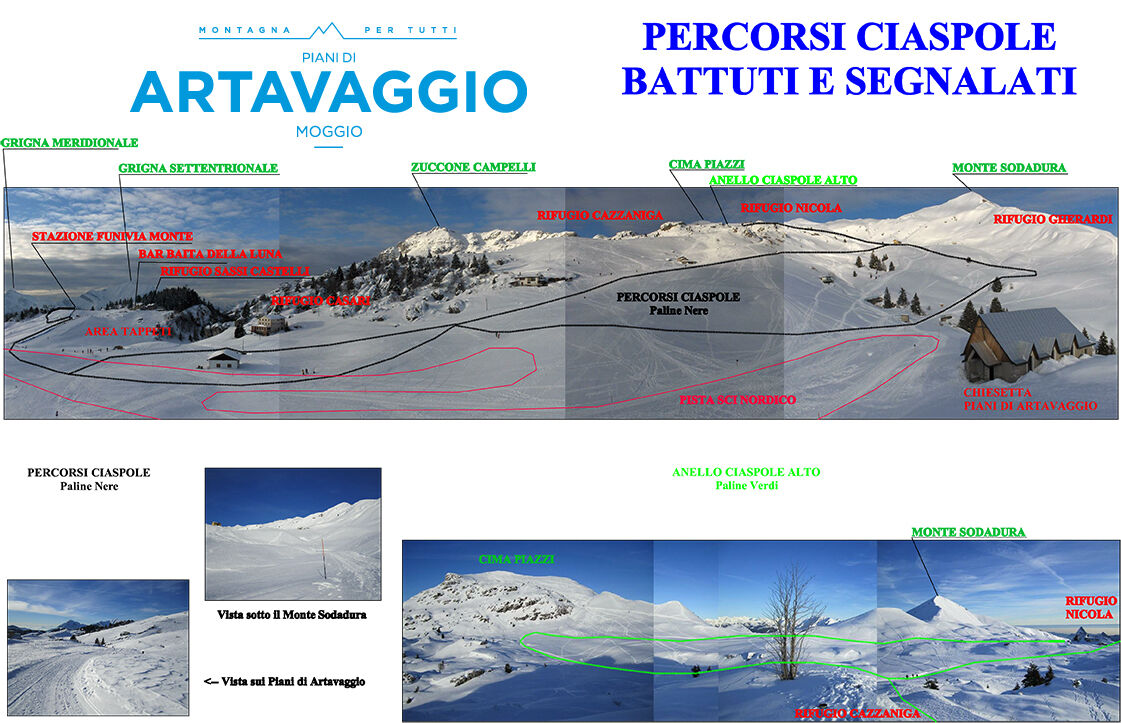 In particolare ai Piani di Bobbio c'è il nuovo percorso Pequeno dedicato alle ciaspole, che parte nei pressi dell'area bob (appena arrivati in quota sulla destra), prosegue verso l'ex Hotel Pequeno, ed è poi possibile ritornare al punto di partenza passando per la nuova seggiovia Orscellera.